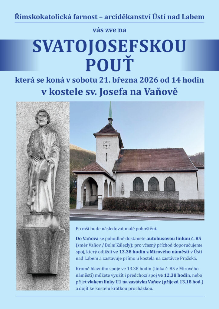 Římskokatolická farnost – arciděkanství Ústí nad Labem vás zve na Svatojosefskou pouť, která se koná v sobotu 21. března 2026 od 14 hodin v kostele sv. Josefa na Vaňově.