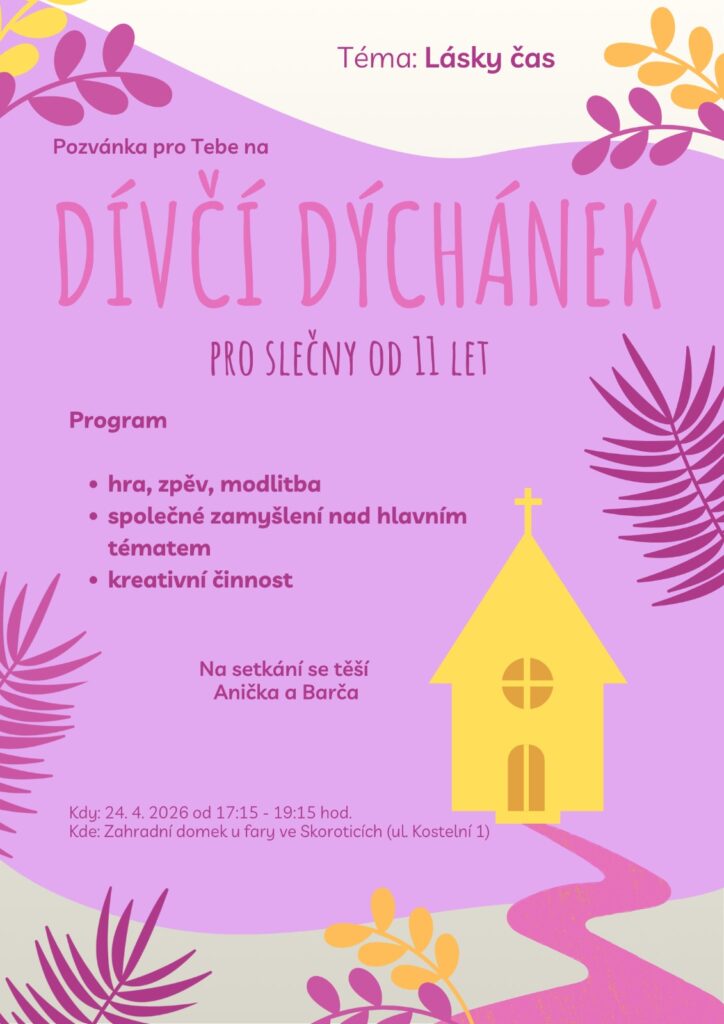 Srdečně zveme slečny od 11 let na Dívčí dýchánek v pátek 24. dubna 2026 od 17.15 do 19.15 hodin, který se bude konat v Zahradním domku u fary ve Skoroticích.