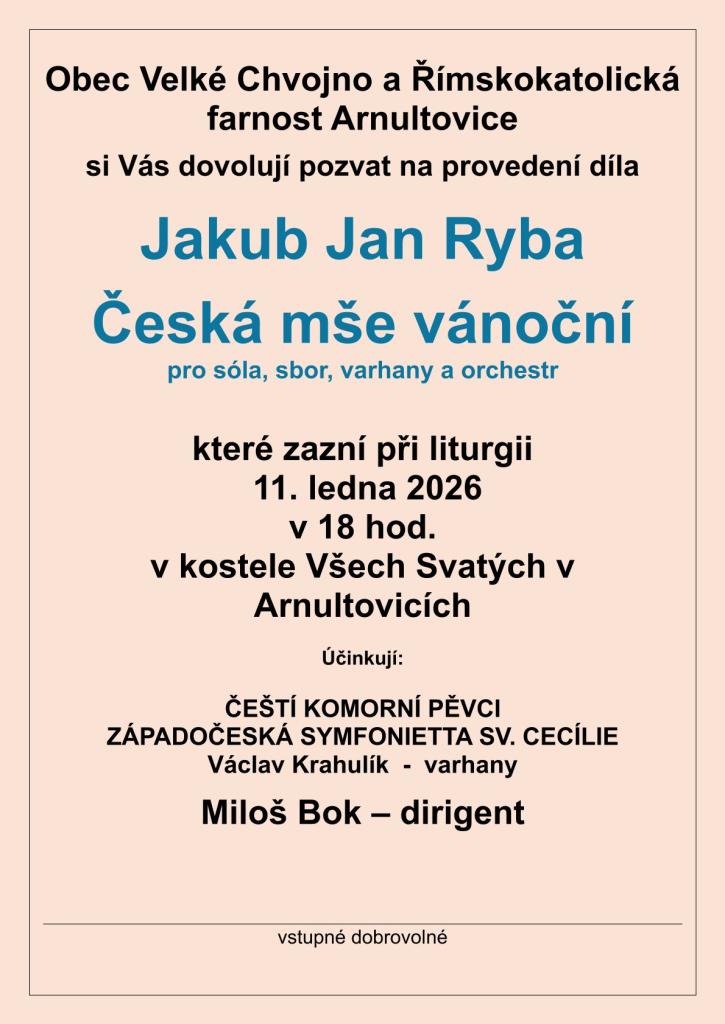Obec Velké Chvojno a Římskokatolická farnost Arnultovice si Vás dovolují pozvat v neděli 11. ledna 2026 od 18 hodin do kostela Všech Svatých v Arnultovicích na provedení České mše vánoční J. J. Ryby.