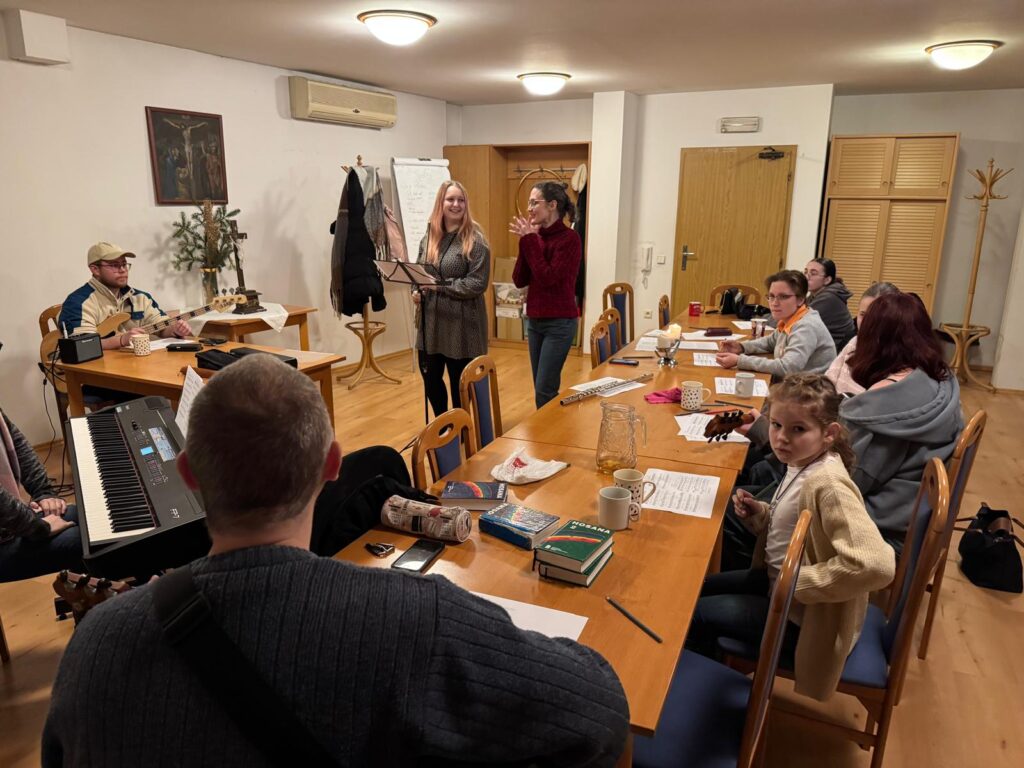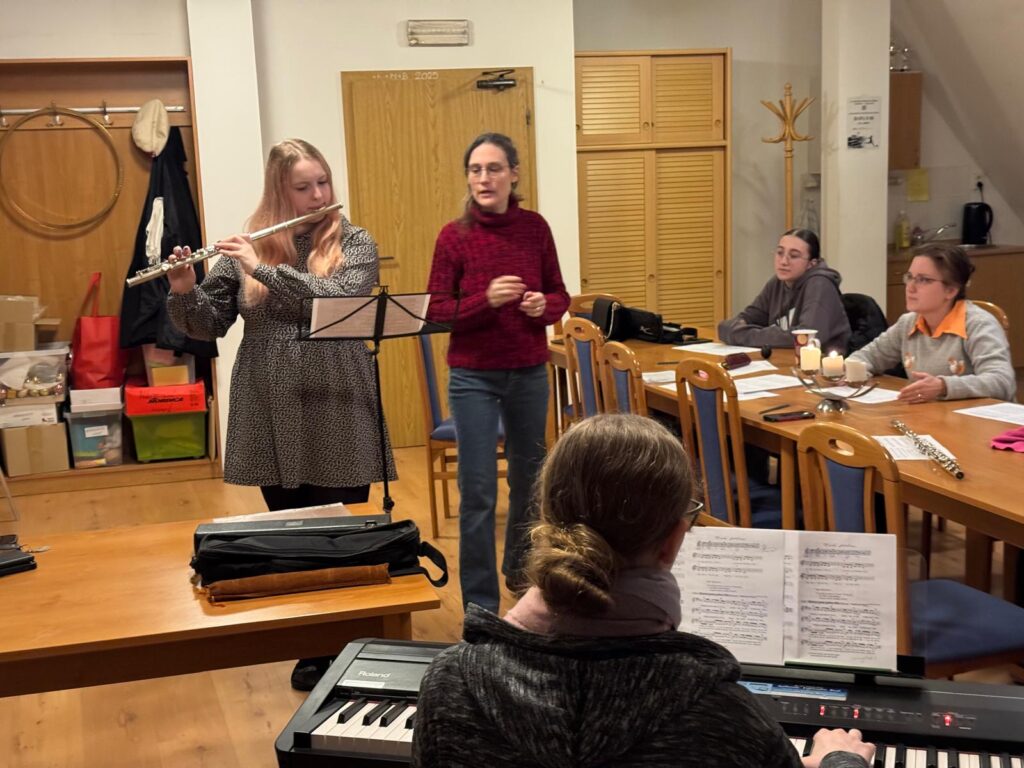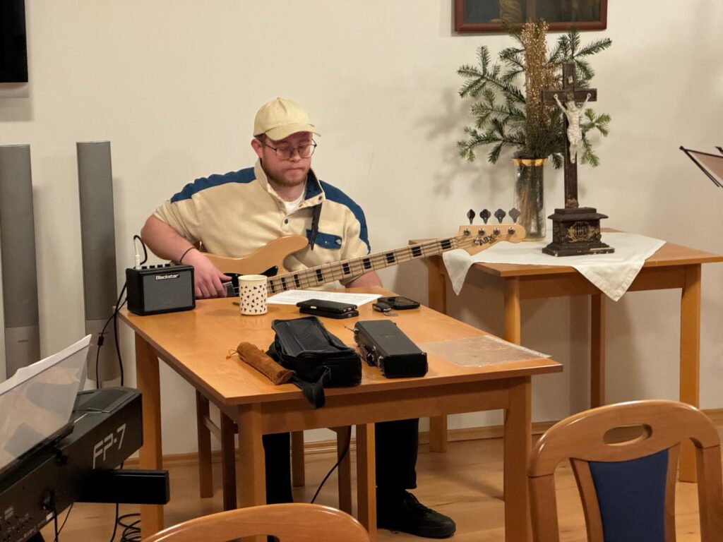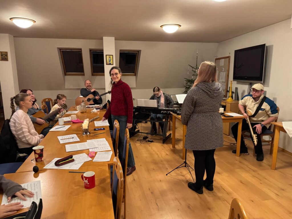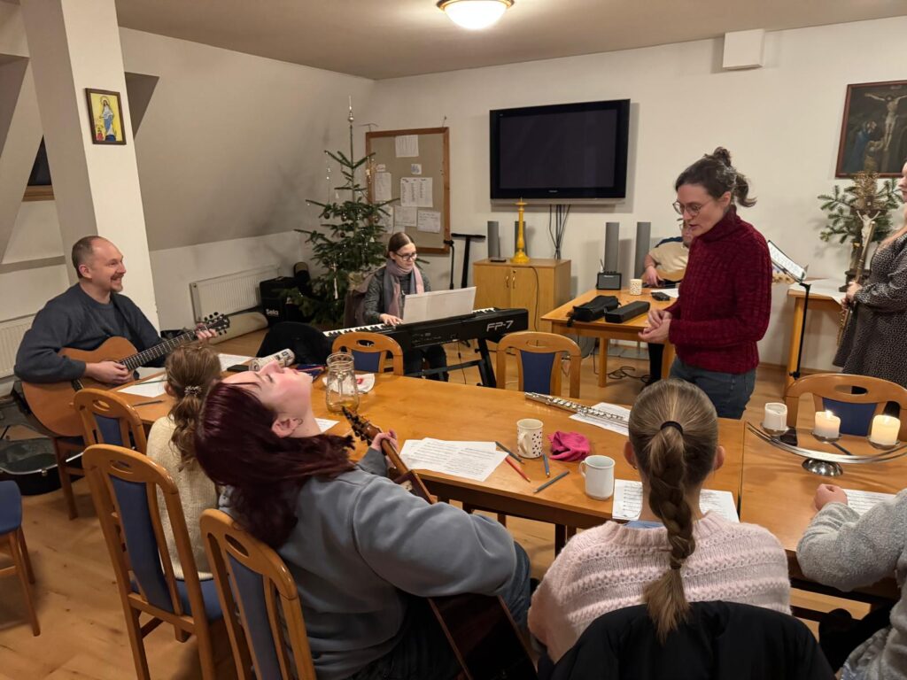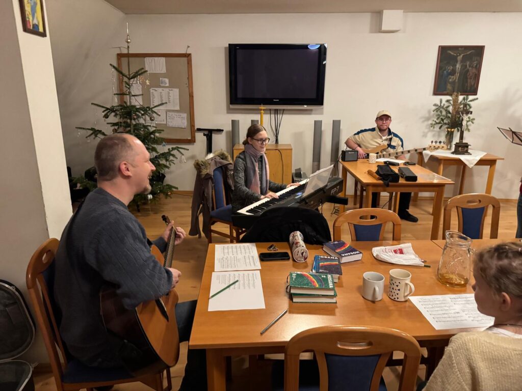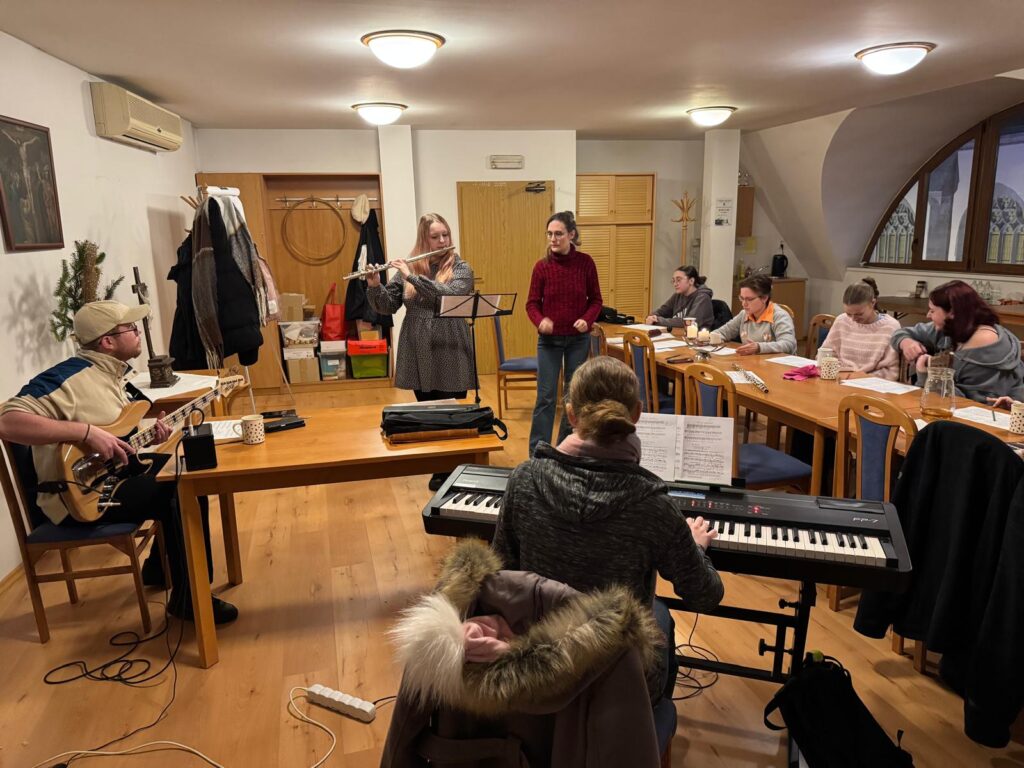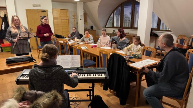 V sobotu 17. ledna 2026 v odpoledních hodinách probíhala ve farním sále zkouška rytmické scholy. Přejeme jim, aby radost z chválení Pána hudbou je vždy provázela, a aby se k nim připojili i další mladí hudebníci.