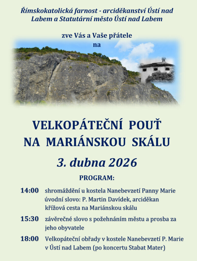 Římskokatolická farnost – arciděkanství Ústí nad Labem a Statutární město Ústí nad Labem zve Vás a Vaše přátele na Velkopáteční pouť na Mariánskou skálu v pátek 3. dubna 2026.